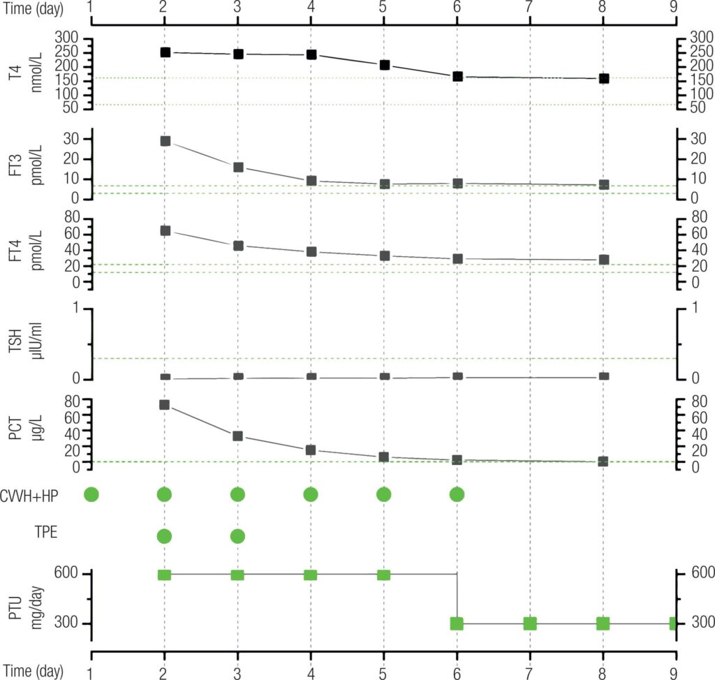Thyroid storm is a rare but well-known life-threatening complication that occurs due to acute exacerbation of thyrotoxicosis with the increased levels of circulating thyroid hormones. Reports of metabolic encephalopathy associated with thyroid storm are scarce. We describe the case of a 23-year-old male patient with no previous history of abnormal thyroid function who had consumed excessive amounts of alcohol before disease onset. The patient was found unconscious and febrile on a roadside by a passerby and was admitted to our hospital’s emergency department. His primary clinical presentation included hyperthermia (40.8 °C), nodal tachycardia (180 beats/min), seizures, coma, and hypoglycemia (2.18 mmol/L). The hypoglycemia was quickly corrected after admission, but his level of consciousness showed no improvement. With aggressive screening, the patient was found to have severe thyroid dysfunction (T3 = 6.67 nmol/L, T4 = 252.00 nmol/L, free T3 = 29.20 pmol/L, free T4 = 65.30 pmol/L, and TSH = 0.001 μIU/mL). After medical treatment, plasmapheresis, hemofiltration, and hemoperfusion, the patient showed substantial improvement in thyroid hormone levels and stabilization of vital signs, but the impaired consciousness and seizures persisted. Multiple computed tomography scans revealed brain abnormalities. Magnetic resonance imaging performed after tracheal extubation revealed bilateral frontal lobe lesions. We reported a case of metabolic encephalopathy in a patient with life-threatening thyroid storm and bilateral frontal lobe lesions. Hypoglycemia may have been involved in the development of encephalopathy in our patient. Health care providers should consider thyroid storm in the differential diagnosis of hyperthermia, seizures, and coma. Early plasmapheresis, hemofiltration, and hemoperfusion can lower T4 levels and improve prognosis in patients with thyroid storm and encephalopathy.