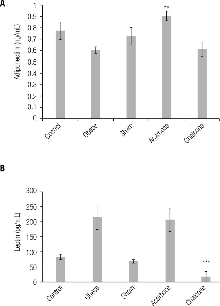 NMRI male mice (n = 48) were subjected to a high fat diet for four weeks, which induced an initial state of obesity. One control group was given normal rodent diet. Obese animals were then switched to normal rodent diet, and divided to four groups (n = 12 in each): untreated, sham (receiving grape seed oil), and experimental groups receiving acarbose and trans-chalcone (12 mg/kg) during eight weeks. Body weight, blood glucose and other biochemical parameters including triglycerides (TG), cholesterol, HDL, AST, and ALT were measured, as well as leptin, adiponectin, TNF-α, and total antioxidant capacity (TAC). Histological studies were performed on adipose cells and liver tissue samples.