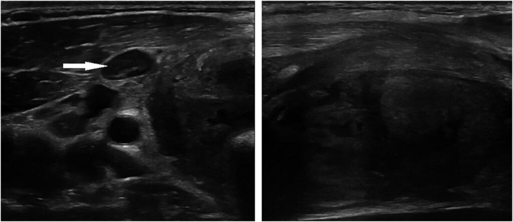 Acute suppurative thyroiditis (AST) is a rare but potentially life-threatening thyroid disease with a high mortality if left untreated. Thus, differentiation from other thyroid disorders is highly important in clinical practice. A 22-year-old male patient was admitted to a tertiary care hospital with cervical pain, palpitations, thyrotoxicosis, and an inhomogeneously enlarged right thyroid lobe. In view of the clinical findings, subacute thyroiditis (SAT) was suspected and treatment with glucocorticoids was started. After initial amelioration, the patient developed cervical erythema, fever, and recurrent pain. A CT scan showed extensive phlegmonous inflammation and abscess formation, suggestive of AST. We started immediate empiric antibiotic therapy and performed surgical drainage of the abscess formations. Subsequently, the patient developed hypoxic respiratory failure, leading to ICU admission and intermittent need for non-invasive ventilation. Blood and abscess cultures were positive for Streptococcus anginosus. If left untreated, AST represents a potentially life-threatening disease. Thus, in clinically doubtful cases, liberal further assessment by means of cervical CT scans or fine needle aspiration biopsy are strongly advised.