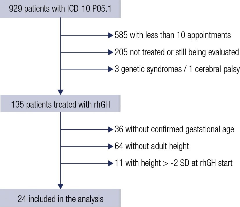 Twenty-four patients (14 boys) were included, with an average gestational age of 38.0 (range: 33.0-40.0) weeks, birth weight of -1.3 ± 0.9 SDS, and birth length of -2.4 ± 0.7 SDS. They were treated with rhGH starting at an average age of 10.3 ± 2.6 years for a duration of 5.4 ± 2.3 years. Height SDS increased from -2.6 ± 0.4 SDS to -1.2 ± 0.6 SDS, which was comparable to the target height SDS (-1.3 ± 0.9; p = 0.3). Although 18 children were classified as good responders, 6 did not achieve a final height SDS > -2.0. Adult height was correlated with the increment in height SDS and growth velocity during the first year of treatment. No significant differences were observed between children classified as SGA by birth weight or length < 10th percentile and those by weight or length < -2.0 SDS.