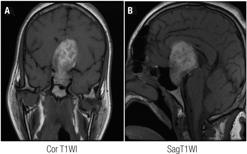Thirty-five patients with pituitary adenoma were included, and 23 (67%) had non-functioning pituitary adenomas. Headache was observed in 31 (89%) patients. No clear precipitating factor was identified. Hypopituitarism was observed in 14 (40%) patients. MRI from 20 patients was analyzed, and 10 (50%) maintained a hyperintense signal in MRI performed more than three weeks after pituitary apoplexy (PA). Surgery was performed in ten (28%) patients, and 25 (72%) were treated conservatively with good outcomes. No AIP mutation was found in this cohort.