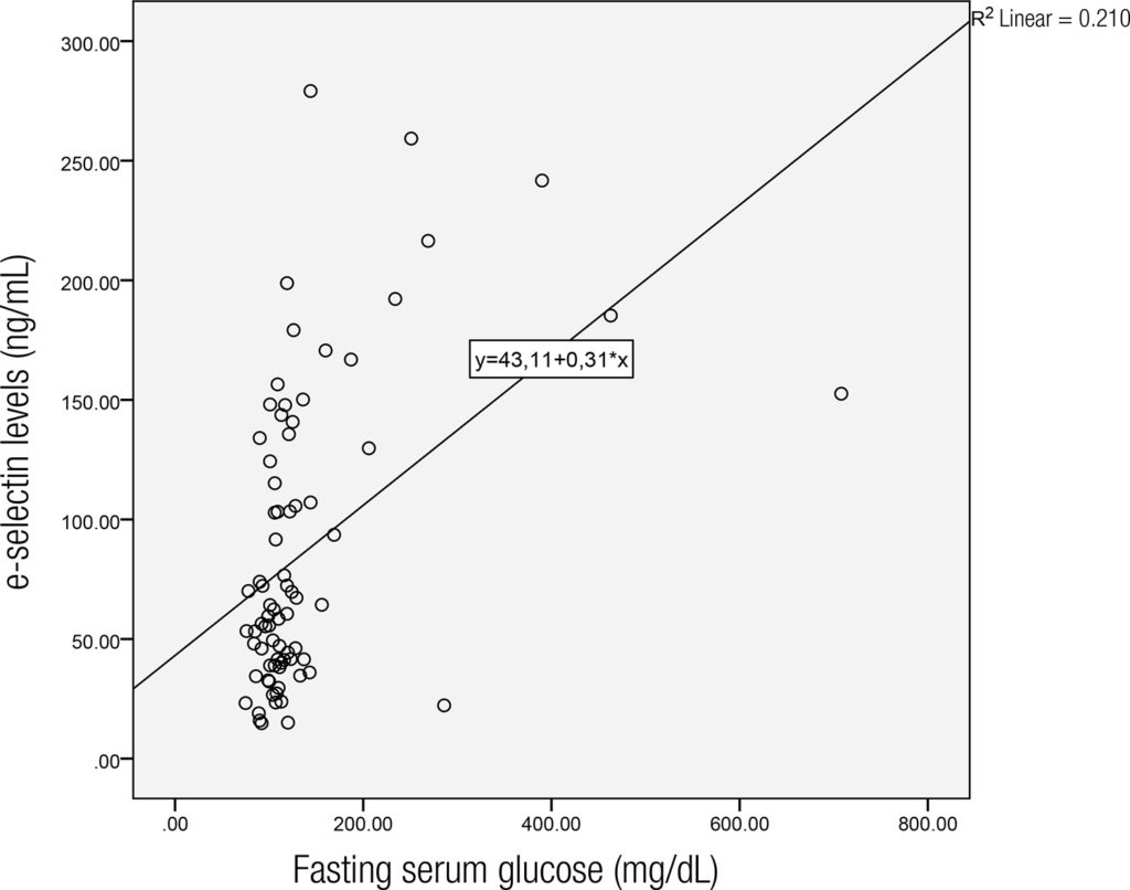 Fasting serum glucose was the most important predictor of serum e-selectin levels. Pulse wave velocity and central aortic pressures were significantly higher in IFG, IGT and T2DM groups, compared to controls (p = 0.001, < 0.001, 0.013 and 0.015, 0.002, 0.009, respectively). The mean arterial pressure did not show any significant association with serum e-selectin and hs-CRP levels (β coefficient: 0.092, p = 0.358; and β coefficient: 0.189, p = 0.362, respectively).