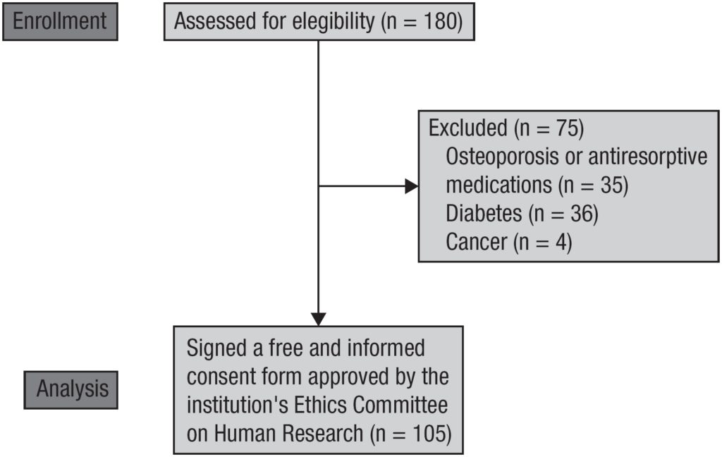 Cross-sectional study including 105 postmenopausal women (age 56.5 ± 6.1 years, body mass index [BMI] 28.2 ± 4.9 kg/m2) grouped based on the presence of three or less, four, or five criteria of metabolic syndrome according to the International Diabetes Federation (IDF). The subjects underwent dualenergy x-ray absorptiometry (DXA) for the assessment of body composition and BMD and blood tests for the measurement of U-osc and bone-specific alkaline phosphatase (BSAP) levels.
