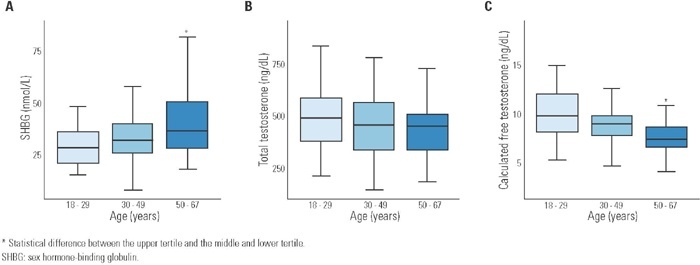 The sample was divided into tertiles according to age (18 to 29; 30 to 49; 50 to 67 years). Sex hormone-binding globulin levels were higher in men > 50 years old compared to those of the second and first tertiles (41 ± 17 versus 35 ± 12 and 29 ± 9 nmol/L; p < 0.001), while values of calculated free testosterone were lower in the older tertile (7.7 ± 1.9 versus 8.8 ± 2.2 and 10.4 ±3.1 ng/dL; p < 0.001). Age did not influence total testosterone levels. Insulin resistance index was inversely and significantly correlated with sex hormone-binding globulin (r = -0.371; p < 0.001).