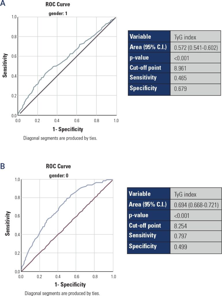 SA incidence increased with increasing TyG index in both men (from 5.929% in Group I to 10.579% in Group IV; P < 0.001) and women (from 2.074% in Group I to 14.955% in Group IV; P < 0.001). Multivariate linear regression analysis revealed that a higher TyG index was associated with an elevated risk of SA in men (odds ratio [OR] 4.028, 95% confidence interval [CI] 2.811-5.711) and women (OR 2.599, 95% CI 1.86-5.543). ROC curve analysis revealed that the area under the curve was 0.572 (95% CI = 0.541-0.602; P < 0.001) for men and 0.694 (95% CI = 0.668-0.721; P < 0.001) for women. The optimal TyG index cutoff points for predicting subclinical atherosclerosis were 8.961 for men (sensitivity, 46.5%; specificity, 67.9%) and 8.254 for women (sensitivity, 79.7%; specificity, 49.9%).
