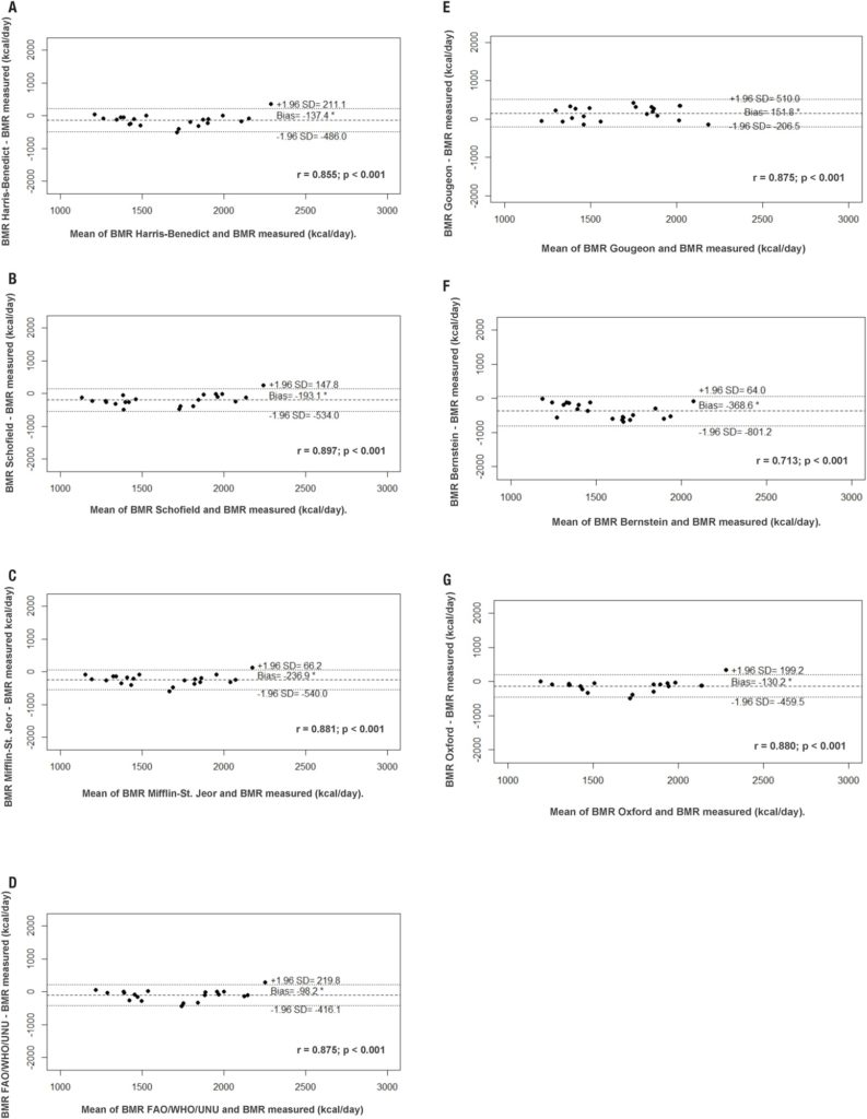 Twenty-one patients with type 2 diabetes participated in this diagnostic test study. Clinical and laboratorial variables were evaluated as well as body composition by absorptiometry dual X-ray emission (DXA) and BMR measured by IC and estimated by prediction equations. Dietary intake was evaluated by a quantitative food frequency questionnaire. Data were analyzed using Bland–Altman plots, paired t-tests, and Pearson’s correlation coefficients.