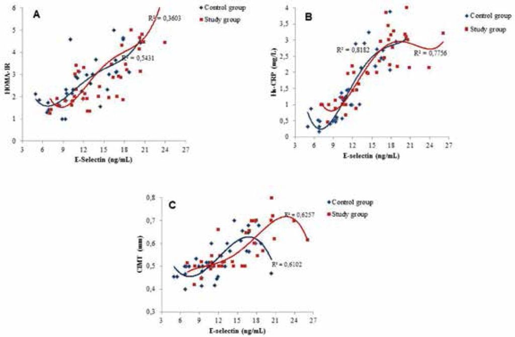 In conclusion, based on significantly higher values for E-selectin, CIMT and HOMA-IR in patients with NFA than controls along with significant correlation of E-selectin levels to CIMT, HOMA-IR and hs-CRP, our findings seems to indicate an increased risk of early atherosclerosis and impaired endothelial function in NFA patients, particularly in case of insulin resistance. Arch Endocrinol Metab. 2015;59(4):310-7