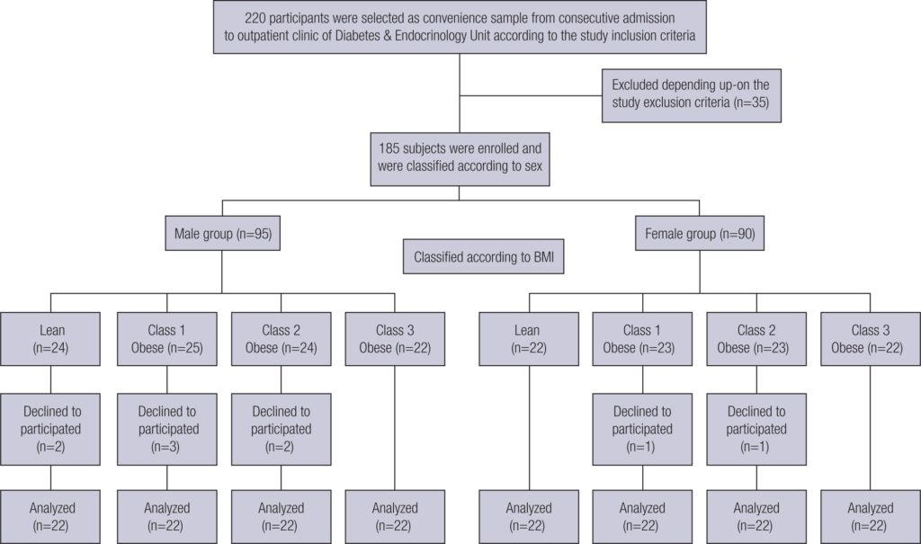 This study included 176 non-diabetic subjects of both sexes who were classified according to their sex into two groups; the male and the female groups. The male group (88 men) was classified according to BMI into; group 1 (22 lean men), group 2 (22 class I obese men), group 3 (22 class II obese men) and group 4 (22 class III obese men). The female group (88 women) was classified according to BMI exactly as the male group. Metabolic parameters, IL-6, clusterin, and irisin levels were measured. Data were analyzed by ANOVA test, post hoc Tukey’s test and independent t-test. Pearson correlation was used to assess the association between variables.