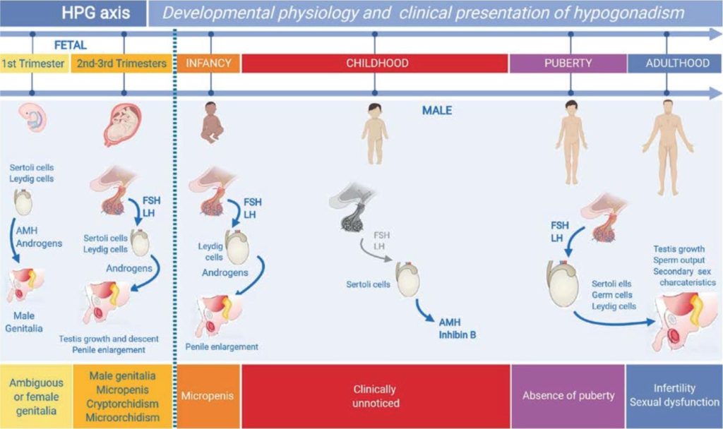 Disorders of pubertal onset and progression are a common cause for referral to paediatric endocrinologists, with delayed puberty in males being particularly frequent. Pubertal development depends on the hypothalamic-pituitary-testicular (HPT) axis, which is established during fetal life and undergoes distinct phases: fetal androgen production, postnatal “minipuberty”, and reactivation during adolescence. Key regulators include GnRH neurons, Sertoli and Leydig cells, and biomarkers such as AMH, inhibin B, testosterone and INSL3. Puberty is marked clinically by testicular enlargement beyond 4 mL, usually at a median age of 11.5 years. Delayed puberty is defined as absence of testicular enlargement by age 14. The most common cause is self-limited delayed puberty (SLDP), often familial and benign. Functional hypogonadotropic hypogonadism due to chronic illness, and permanent central hypogonadism (congenital or acquired), account for additional cases. Congenital hypogonadotropic hypogonadism (CHH), including Kallmann syndrome, is frequently genetic, with variants in genes such as FGFR1, ANOS1 and GNRHR. Clinical assessment includes family history, growth patterns, and red flags such as micropenis, cryptorchidism or anosmia.