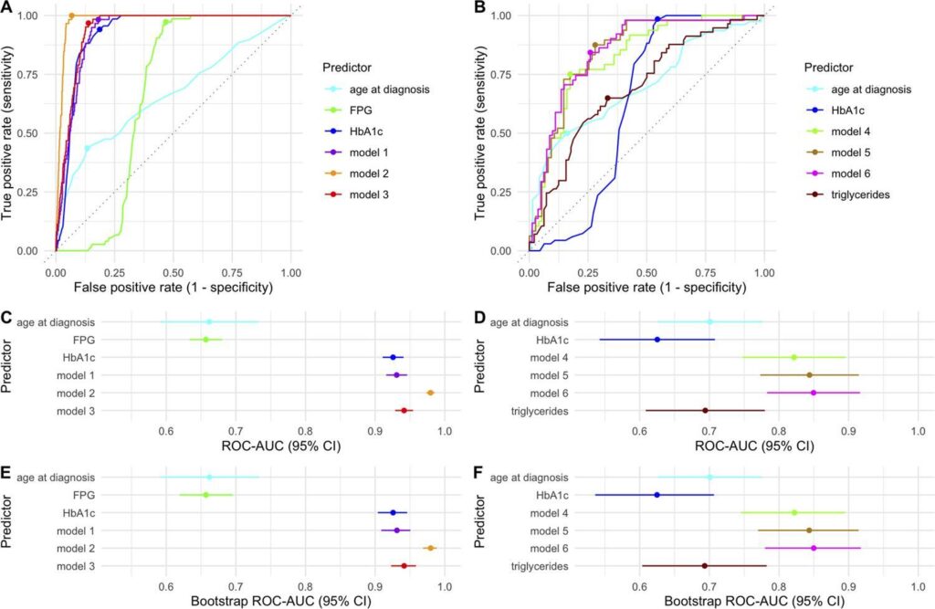 The study included 2,687 patients with T1D, 202 patients with clinical features of MODY but without associated genetic variants (NoVar), and 100 patients with GCK-MODY (GCK). Area under the receiver-operating characteristic curve (ROC-AUC) analyses were used to assess the performance of each parameter – both alone and incorporated into regression models – in discriminating between groups.