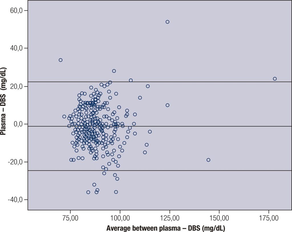 307 pregnant women were evaluated, 88.6% without diabetes and 11.4% with previous diabetes. The glucose ranged from 66 to 190 mg/dL [3.66 to 10.55 mmol/L] in plasma and from 53 to 166 mg/dL [2.94 to 9.21 mmol/L] in DBS. The glucose average values were 88.1 ± 12 mg/dL [4.98 ± 0.67 mmol/L] in plasma and 89.2 ±11,5 mg/dL, [4.95 ± 0.64 mmol/L] in DBS – p-value = 0.084. The ICC value was moderate (0.510), and Pearson’s correlation coefficient was r = 0.507 p < 0.001. Altman and Bland’s graph showed that difference between the values obtained by both methods is -24.62 to 22.3 mg/dL [-1.37 to 1.24 mmol/L]. Significant fixed bias (-1,16 average difference) and proportional bias (r = 0.056; p = 0.33) were not observed. Anemia was associated with differences between plasma glucose and DBS measurements (p = 0.031).