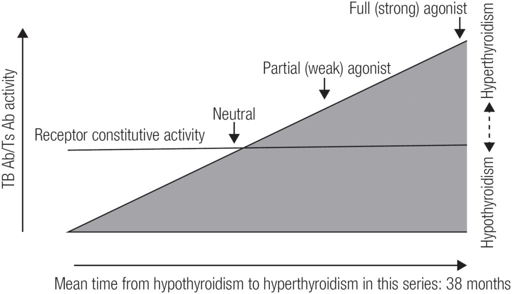 The conversion of Hashimoto’s thyroiditis (HT) to hyperthyroidism due to thyrotropin receptor antibodies is intriguing and considered rare. The contribution of TSH receptor blocking antibodies (TRAb), which may be stimulators (TSAb) or blockers (TBAb), is suspected. We describe clinical and biological variables in a series of patients switching from Hashimoto’s thyroiditis to Grave’s disease.