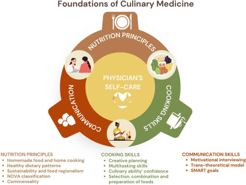 The poor diet quality in line with the rising prevalence of noncommunicable chronic diseases, coupled with the substantial deficit in nutritional education within medical training programs, has precipitated the emergence of Culinary Medicine as an evolving discipline. Culinary Medicine fuses the art of home cooking with the sciences of human nutrition, psychology, gastronomy, and medicine to promote health and well-being. This comprehensive narrative review explores the diverse facets of Culinary Medicine, elucidating its historical evolution, theoretical foundations, educational initiatives in Brazil and worldwide, and its practical implementation in clinical contexts. By integrating evidence-based nutrition knowledge with culinary skills, behavior change tools, and well-established principles of healthy dietary practices, Culinary Medicine arrives to empower individuals – physicians and patients – to make informed dietary choices and enhance their overall health outcomes. Moreover, this review contemplates the roles of physicians in providing dietary guidance within the Culinary Medicine paradigm and the challenges associated with incorporating Culinary Medicine as a complementary facet of conventional medical care and medical education.