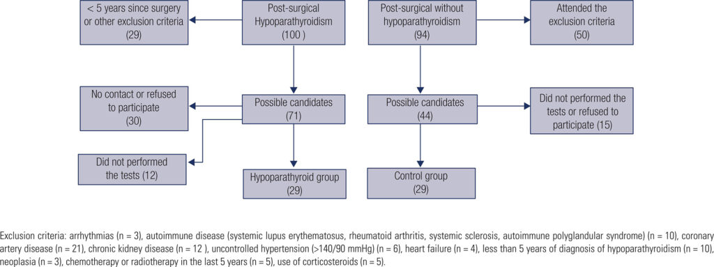 Patients with post-surgical hypoparathyroidism (HG = 29) were compared to a control group (CG = 29), matched by sex and age. Demographic and clinical data were captured by a questionnaire or patient files. Both groups performed a thoracic-computed tomography to evaluate the CACS and the cardiovascular risk was calculated by two risk calculators.