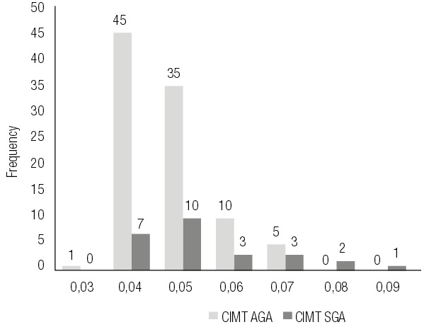 A cross-sectional study was carried out over a 1-year period (Jul 2013 – June 2014). We analyzed 122 obese patients aged 4-20 (mean age 14.9 ± 2.28). Twenty-six patients were born SGA. CIMT was measured in all the patients. Using ROC curve, cut-off values were obtained for both groups.
