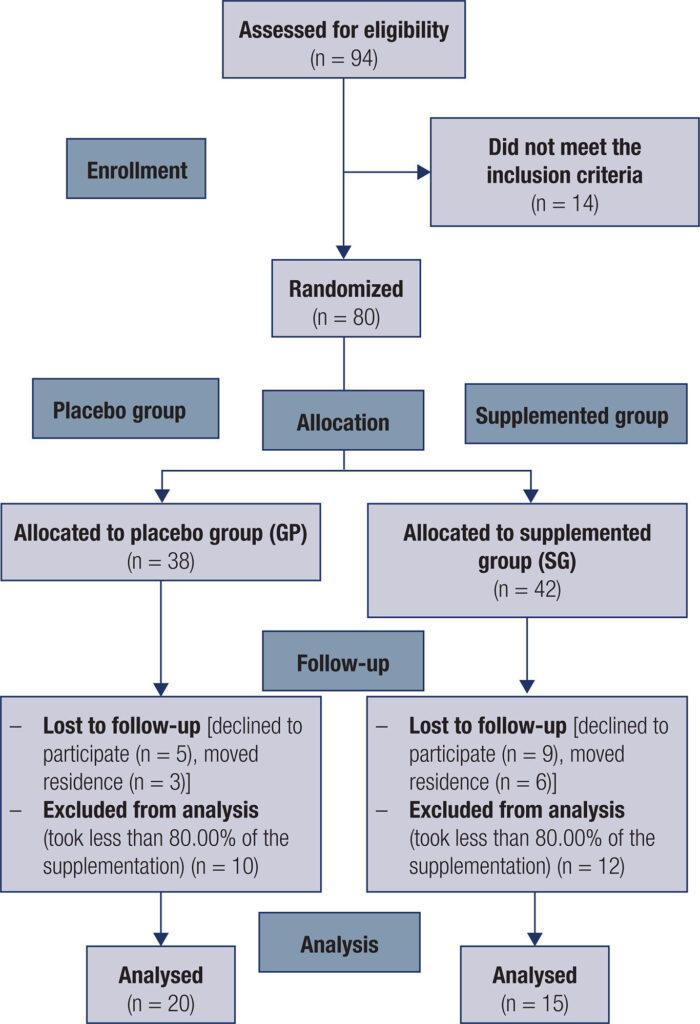 This is a blind, randomized, placebo-controlled clinical trial conducted in 2016 with 35 Brazilian women with high waist circumference (WC). In total, 80 participants were randomized [38 in the placebo group (PG) and 42 in the supplemented group (SG)], but at the end of the protocol, 20 individuals in the PG and 15 in the SG were evaluated. The sample consumed one capsule of curcumin (500 mg/day) (Curcumin C3 Complex®) or a placebo for 90 days. Body weight, height, body mass index, WC, body fat, fat free mass, fasting glucose (FG), lipid profile [triglycerides (TGs), total cholesterol (TC), HDL-c and LDL-c], physical activity level and food intake (energy, carbohydrate, total fat and protein) data were evaluated before and after the intervention.