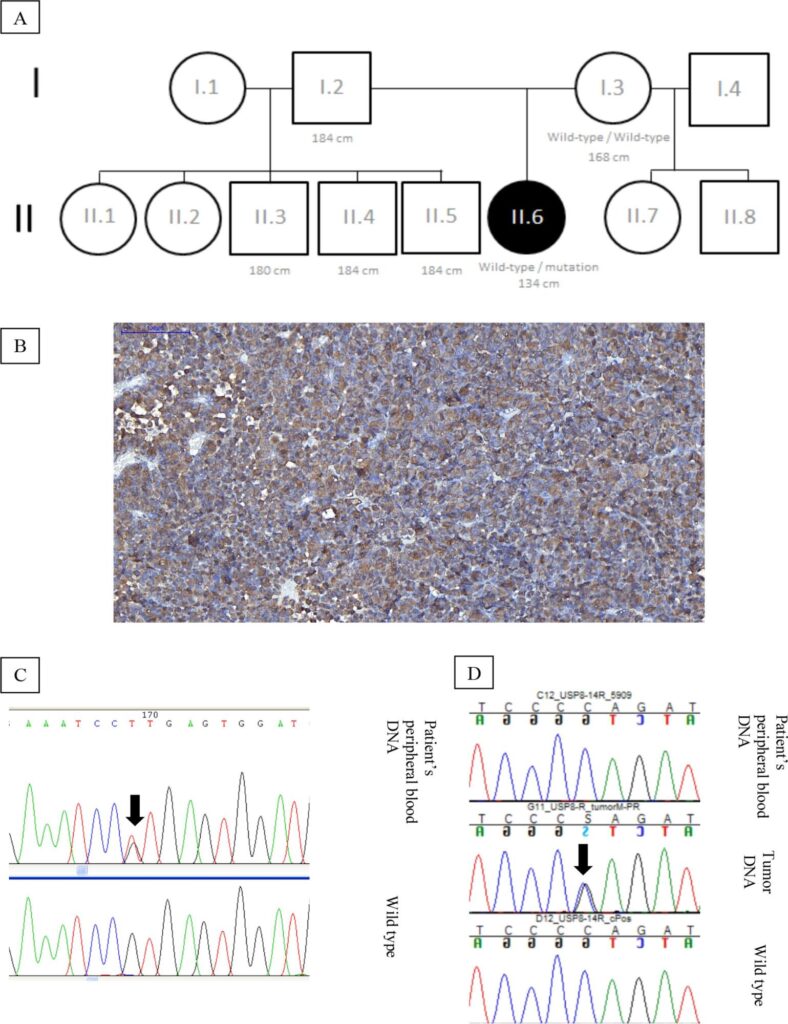 We present the unique case of an adult Brazilian woman with severe short stature due to growth hormone deficiency with a heterozygous G to T substitution in the donor splice site of intron 3 of the growth hormone 1 (GH1) gene (c.291+1G>T). In this autosomal dominant form of growth hormone deficiency (type II), exon 3 skipping results in expression of the 17.5 kDa isoform of growth hormone, which has a dominant negative effect over the bioactive isoform, is retained in the endoplasmic reticulum, disrupts the Golgi apparatus, and impairs the secretion of other pituitary hormones in addition to growth hormone deficiency. This mechanism led to the progression of central hypothyroidism in the same patient. After 5 years of growth and thyroid hormone replacement, at the age of 33, laboratory evaluation for increased weight gain revealed high serum and urine cortisol concentrations, which could not be suppressed with dexamethasone. Magnetic resonance imaging of the sella turcica detected a pituitary macroadenoma, which was surgically removed. Histological examination confirmed an adrenocorticotropic hormone (ACTH)-secreting pituitary macroadenoma. A ubiquitin-specific peptidase 8 (USP8) somatic pathogenic variant (c.2159C>G/p.Pro720Arg) was found in the tumor. In conclusion, we report progression of isolated growth hormone deficiency due to a germline GH1 variant to combined pituitary hormone deficiency followed by hypercortisolism due to an ACTH-secreting macroadenoma with a somatic variant in USP8 in the same patient. Genetic studies allowed etiologic diagnosis and prognosis of this unique case.