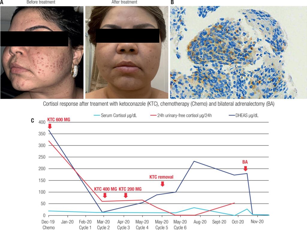 We report a rare case of Cushing’s syndrome in a 37-year-old female who initially presented with localized acinic cell carcinoma of the parotid gland. In January 2014, she underwent a right parotidectomy with facial nerve preservation and adjuvant radiotherapy. In August 2018, she presented a histologically-proven local regional relapse. The patient was considered for salvage surgery with facial nerve sacrifice and remained with no evidence of disease. One year later the patient developed pulmonary dissemination and started to gain weight and developed facial plethora and acne on the face and upper trunk. In a physical examination, the patient presented moon face, buffalo hump, acne and stage 2 hypertension. Biochemical evaluation confirmed ACTH-dependent Cushing’s syndrome. IHC for ACTH in the lung biopsy revealed strong positive staining for ACTH confirming a diagnosis of ectopic ACTH secretion by a metastatic parotid acinic cell carcinoma. Ketoconazole (600 mg/d) was started to treat the CS. In addition, as chemotherapy was initiated to treat the metastatic disease. After the fifth cycle of chemotherapy, ketoconazole was suspended and the patient remained in remission of CS for four months, when CS recurred. A unique feature of this case is related to the clinical CS relapse associated with disease progression, which needed prompt treatment with ketoconazole, resulting in a significant improvement in the patient’s condition. Although rare, should be attentive for possible CS features in patients with high-grade salivary gland carcinomas, since the diagnosis of ectopic secretion of ACTH may significantly impact their management and outcomes.