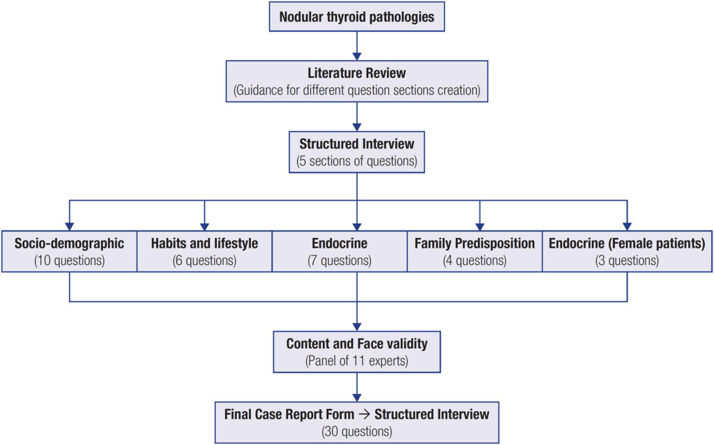 The aim of this study is to develop and validate a novel clinical report form in the format of a structured interview to enable the characterization of the Portuguese population of the Baixo Vouga region with different subtypes of nodular thyroid pathologies (NTyPs).