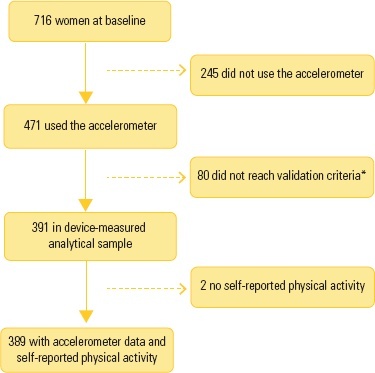To quantify moderate-to-vigorous physical activity (MVPA) at postpartum in women with recent gestational diabetes mellitus, using an accelerometer and self-reported measurements from participants of the LINDA-Brasil study.