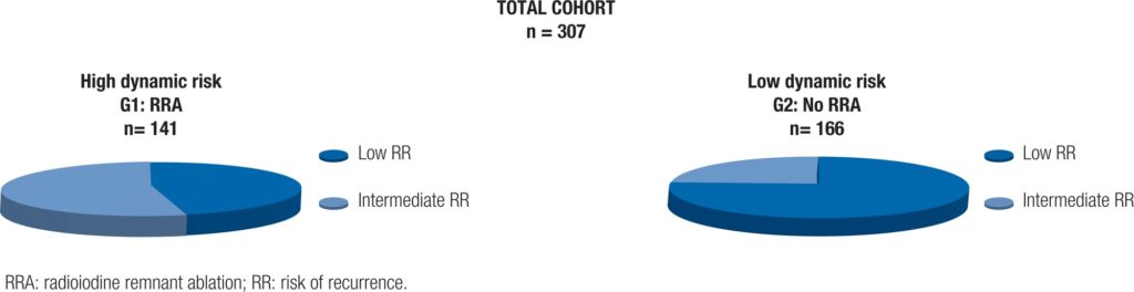 We included 307 DTC patients with LRR and IRR submitted to total thyroidectomy. All patients were reclassified according to the dynamic risk stratification (low or high). Patients with high dynamic risk received RRA (141 patients).