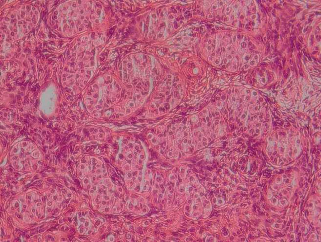 Biopsy of the right gonad showing germ cells intermingled with seminiferous tubules with decreased diameter.