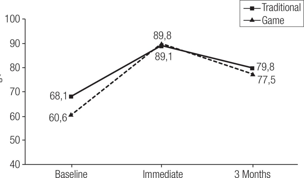 Mean knowledge/skills score was improved from 68% to 89% in traditional education group (n = 23; p < 0.001), and from 61% to 90% in game group (n = 18; p < 0.001). After 3 months, mean score decreased (to 80% in traditional education group, and to 78% in game group; p < 0.001 for both) but remained significantly higher than at baseline in both groups (p < 0.001 for both). Although mean score was lower in game group than in traditional education group at baseline (p = 0.04), no difference remained between groups either immediately or 3 months post-intervention. Score increment was better with the game (29%) than with traditional education (21%; p = 0.04). Beliefs improved in the game group only.