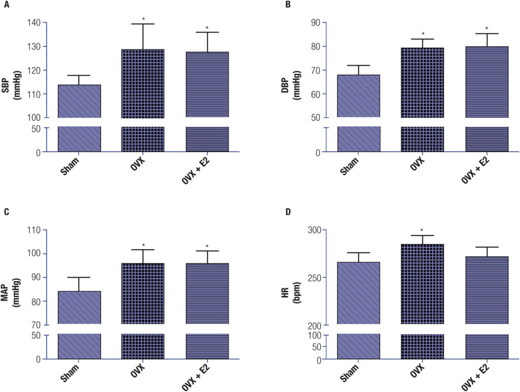 Eighteen female Wistar rats were equally distributed into three treatment groups. Animals in Group I (sham-operated) and Group II (ovariectomized [OVX]) received oral saline solution at a dose of 2 mL/kg. Group III (OVX+E2) received oral E2 2 µg/mL/kg after ovariectomy. Hemodynamic parameters and baroreflex sensitivity were determined in all groups. Plasma levels of malondialdehyde (MDA), superoxide dismutase (SOD), and nitric oxide (NO) were measured, along with those of the inflammatory markers tumor necrosis factor-alpha (TNF-α), interleukin-6 (IL-6), and high mobility group box-1 (HMGB-1).