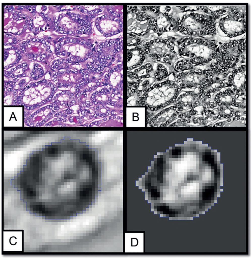 Slides with histological material from 15 cases of NIFTP and 33 cases of FVPTC subtypes (22 IEFVPTC, and 11 IFVPTC) were analyzed using the Image J image processing program. Tumour cells were compared for both nuclear morphometry and chromatin textural characteristics.