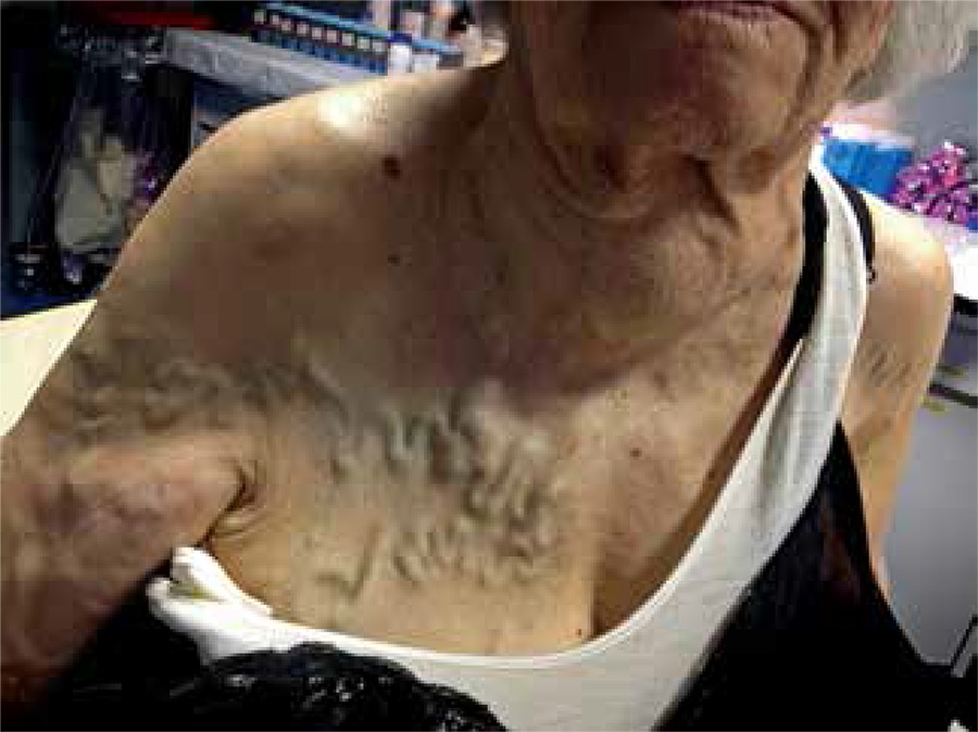 A 78-year-old female patient of countryside arrived to general practitioner (GP) for medial cervical mass with reported slow growing (about 50 years) and recent superficial vein dilatation noted by her daughter. On clinical examination the diagnosis of multinodular goitre visible at distance with extrinsically right innominate vein – superior vena cava compression and subcutaneous collateral vein formation was done (). Patient underwent ultrasound scan that demonstrate increase volume of thyroid gland with partial substernal extension (incomplete intrathoracic goitre), heterogeneous morphology without well-defined nodules, areas of possible hemorrhage and focal calcifications (). Patient was selected for thyroid surgery.
