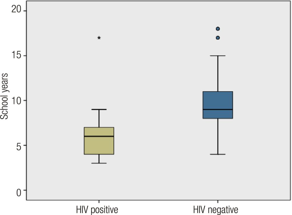 95 adult TW were selected. Information concerning verbal and physical aggression, school dropout, school years (SY), and educational level were assessed. HIV status was screened using a fourth-generation immunoassay followed by western blot testing.