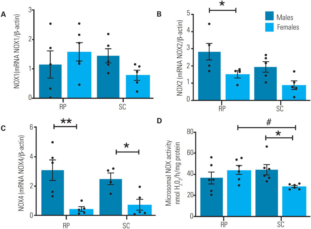 The retroperitoneal fat pad in males compared with females had greater NOX2 and NOX4 expression, along with higher superoxide dismutase activity. Additionally, their subcutaneous fat pad had greater NOX4 expression and higher intracellular H2O2 production, together with greater expression and activity of both superoxide dismutase and catalase.
