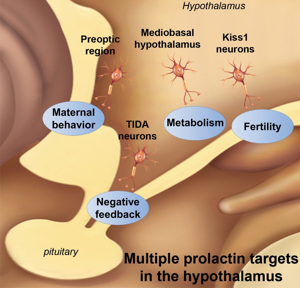Prolactin is best known for its effects of stimulating mammary gland development and lactogenesis. However, prolactin is a pleiotropic hormone that is able to affect several physiological functions, including fertility. Prolactin receptors (PRLRs) are widely expressed in several tissues, including several brain regions and reproductive tract organs. Upon activation, PRLRs may exert prolactin’s functions through several signaling pathways, although the recruitment of the signal transducer and activator of transcription 5 causes most of the known effects of prolactin. Pathological hyperprolactinemia is mainly due to the presence of a prolactinoma or pharmacological effects induced by drugs that interact with the dopamine system. Notably, hyperprolactinemia is a frequent cause of reproductive dysfunction and may lead to infertility in males and females. Recently, several studies have indicated that prolactin may modulate the reproductive axis by acting on specific populations of hypothalamic neurons that express the Kiss1 gene. The Kiss1 gene encodes neuropeptides known as kisspeptins, which are powerful activators of gonadotropin-releasing hormone neurons. In the present review, we will summarize the current knowledge about prolactin’s actions on reproduction. Among other aspects, we will discuss whether the interaction between prolactin and the Kiss1-expressing neurons can affect reproduction and how kisspeptins may become a novel therapeutic approach to treat prolactin-induced infertility.