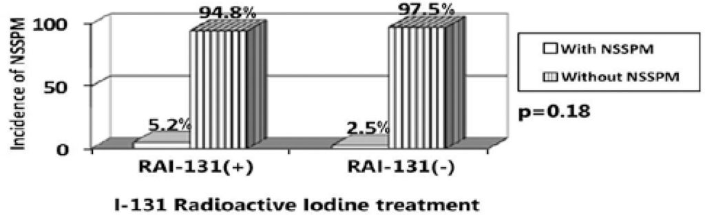 In our cohort of DTC survivors, with a long-term follow-up period, RAI-131 treatment and I-131 cumulative dose were not significantly associated with NSSPM occurrence. A tendency of premature NSSPM occurrence among patients treated with RAI-131 was observed, suggesting an anticipating oncogenic effect by interaction with other risk factors.