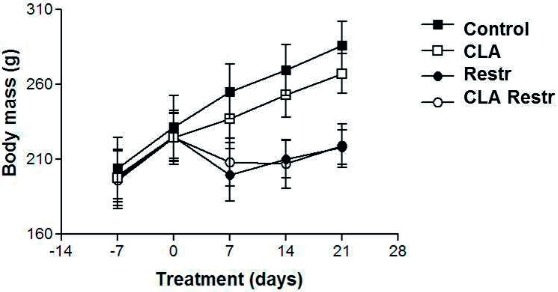 Complexes like conjugated linoleic acid (CLA) reduce the percentage of body fat by increasing energy expenditure, fat oxidation, or both. The aim of this study was to verify if CLA is able to mimic caloric restriction (CR), and determine the effects of CLA on liver metabolic profile of young adult male Wistar rats.
