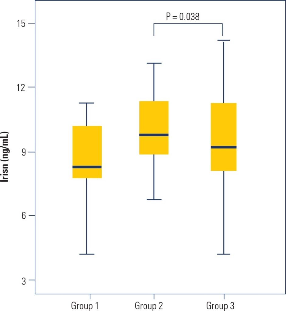 The study subjects were predominantly female (75%), white (82%), with a mean age of 46 ± 14 years. Group 3 had lower irisin levels compared to Group 2: 9.1 ± 2.2 versus 10.7 ± 2.8 ng/mL; p = 0.038). Irisin was negatively correlated with weight (r = -0.246; p = 0.042), waist circumference (r = -0.272; p = 0.024), glucose (r = -0.259; p = 0.039), glycated hemoglobin (r = -0.283; p = 0.024), triglycerides (r = -0.414; p = 0.024), and positively correlated with HDL (r = 0.280; p = 0.029).