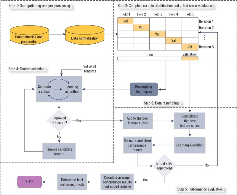 At the Endocrinology Unit of a tertiary public hospital in Rio Grande do Sul, Brazil, a retrospective cohort study analyzed initial consultations from January 1, 2015, to December 31, 2017, focusing on 617 patients with diabetes. Within this group, 82.98% (512 patients) did not require hospitalization, while 17.02% (105 patients) were hospitalized at least once. Multiple machine learning algorithms were tested, and the combination of XGBoost and Instance Hardness Threshold models displayed the best predictive performance. The SHapley Additive exPlanations method was used for result interpretation.