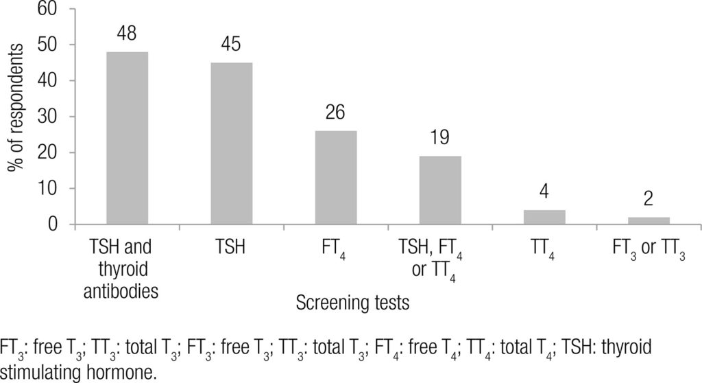 Eighty-one per cent of the endocrinologists screen all their pregnant patients for thyroid dysfunction, mostly during the pregestational period or after the first prenatal visit. Following screening, 82% of the respondents initiate treatment when TSH levels are > 2.5 mIU/L while 67% monitor their pregnant patients even if TSH was normal on first trimester screening. For hypothyroid women who are planning pregnancy, 96% of the clinicians are aware of the importance of adjusting the levothyroxine (LT4) dose as soon as pregnancy is confirmed. However, opinions diverge with respect to adjusting the LT4 dose before or after reassessing thyroid function. The most widely used tests for monitoring pregnant women in use of LT4 are TSH and free T4 (62%) or TSH alone (21%). Unanimously, the treatment goal is to achieve the target TSH level for each trimester of gestation.