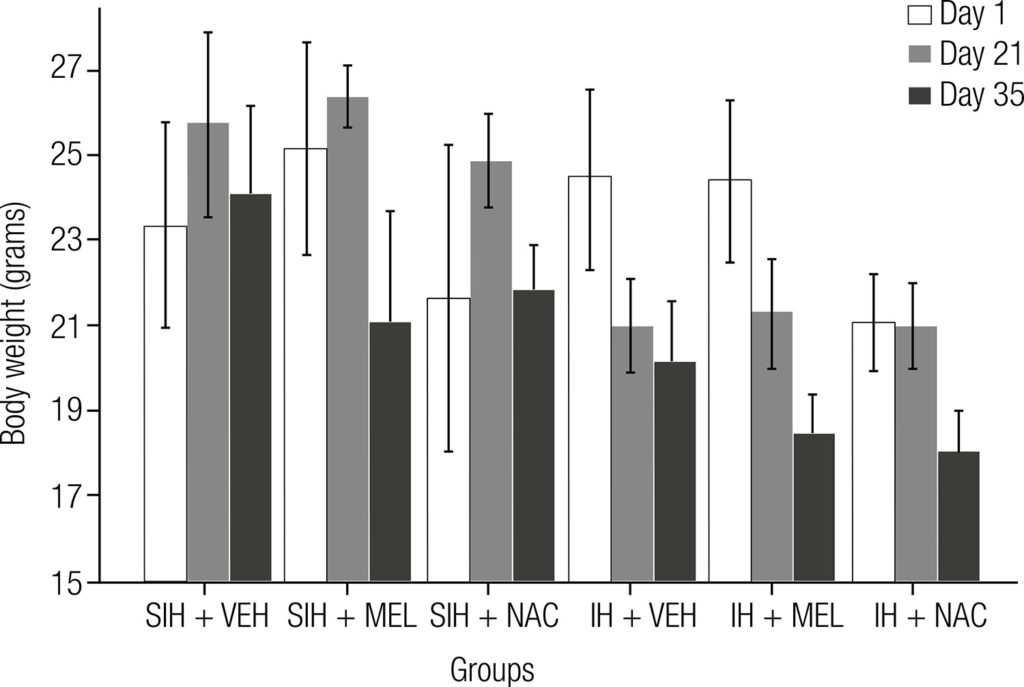 Two groups of Balb/c mice were exposed to intermittent hypoxia (n = 36) or sham intermittent hypoxia (n = 36) for 35 days. The intermittent hypoxia group underwent a total of 480 cycles of 30 seconds reducing the inspired oxygen fraction from 21% to 7 ± 1% followed by 30 seconds of normoxia, during 8 hours daily. Melatonin or N-acetylcysteine were injected intraperitonially daily from day 21 on.