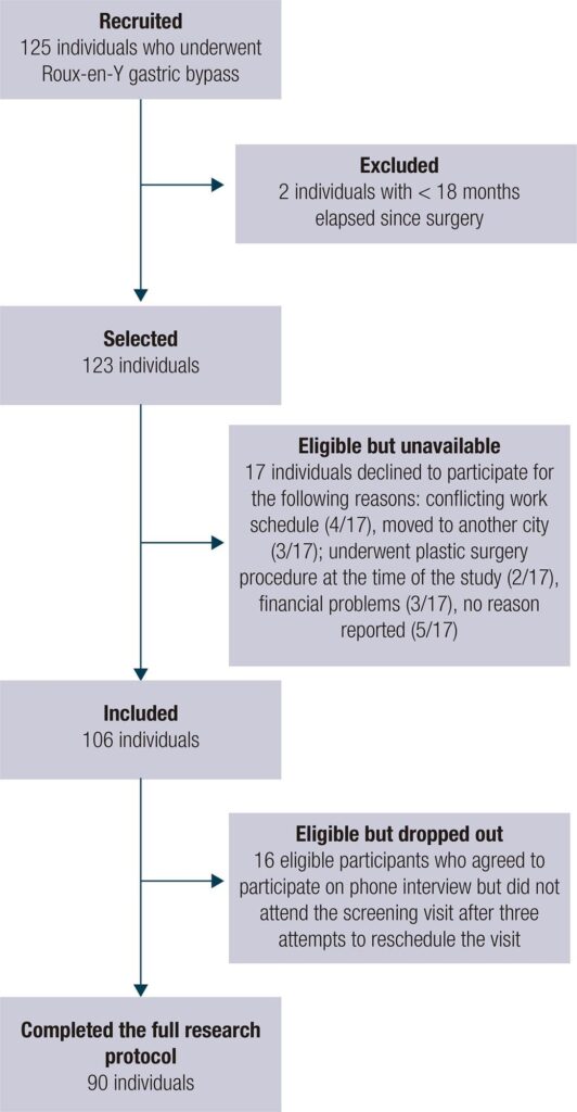 This cross-sectional study recruited 90 outpatients who underwent Roux-en-Y gastric bypass surgery. Anthropometric measurements were collected retrospectively from medical charts. The Structured Clinical Interview for Diagnostic and Statistical Manual of Mental Disorder-IV (DSM-IV) Axis I Disorders (SCID-I) was applied to evaluate psychiatry diagnoses. Validated self-report instruments were used to assess depression, anxiety, alcohol use, impulsivity, binge eating, and body image dissatisfaction. Weight regain was defined as a ≥20% increase from the maximum weight lost. Level of evidence: Level III, cross-sectional study based on a well-designed study.