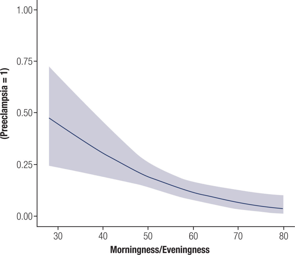 Among 305 patients with GDM, evening preference was found in 21 (6.9%). Patients with evening preference had worse sleep quality (p < 0.01), greater severity of insomnia (p < 0.005), fatigue (p < 0.005) and depressive symptoms (<0.009). Evening chronotype was associated with preeclampsia [p = 0.01; OR = 0.27; CI 0.09-0.79] and a greater need for admission to a neonatal intensive care unit (NICU) [p = 0.02; OR = 0.23; CI .0.06-0.80]. A lower MEQ score confirmed an association with preeclampsia [p = 0.002; OR = 0.94; CI 0.90-0.97] and this was maintained after controlling for age, arterial hypertension, sleep quality, fatigue and depressive symptoms [p < 005; OR = 0.91; CI 0.87-0.95].