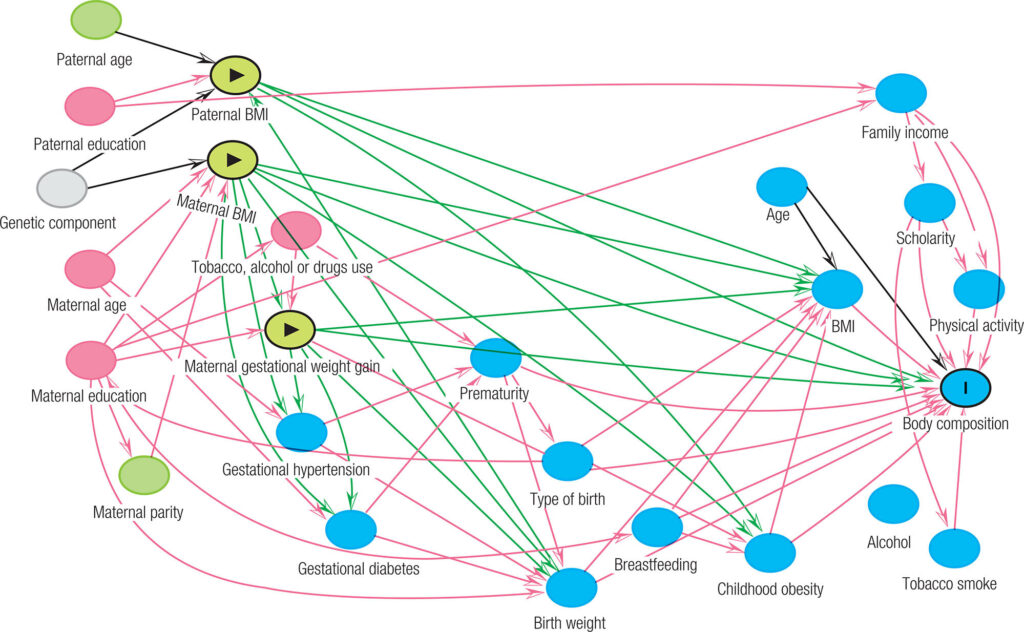 This is cross-sectional analysis of female participants of the NutriHS who were submitted to questionnaires, clinical examinations and body composition assessed by DXA. Association of pre-conception parental BMI and maternal gestational weight gain (exposures) with body composition measurements (outcomes) were analyzed using multiple linear models adjusted for Directed Acyclic Graphs-based covariables (maternal and paternal educational level, maternal age, and tobacco, alcohol and/or drugs use). The sample included 124 women (median 28 (24-31) years) with a mean BMI of 25.4 ± 4.7 kg/m2.