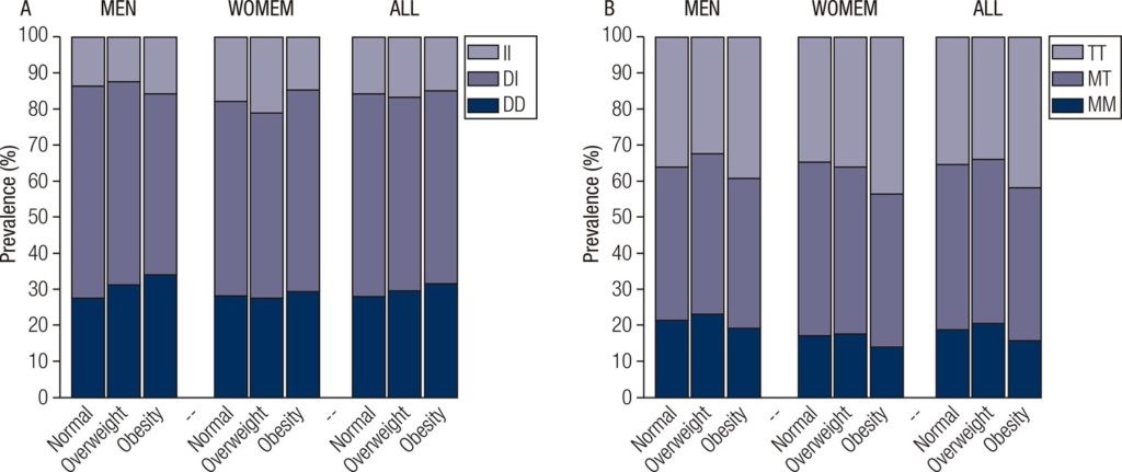 The prevalence of overweight was higher among men, whereas obesity was more prevalent among women. However, the frequency of ACE or AGT polymorphisms was similar among body mass index (BMI) categories. In addition, the mean age-adjusted BMI averages did not change significantly for ACE or AGT polymorphisms, regardless of sex or BMI category. The age-adjusted BMI average for the combination of ACE and AGT genotypes evidenced no significant differences regardless of sex or BMI categories. Results were similar when BMI was replaced by waist circumference (WC).