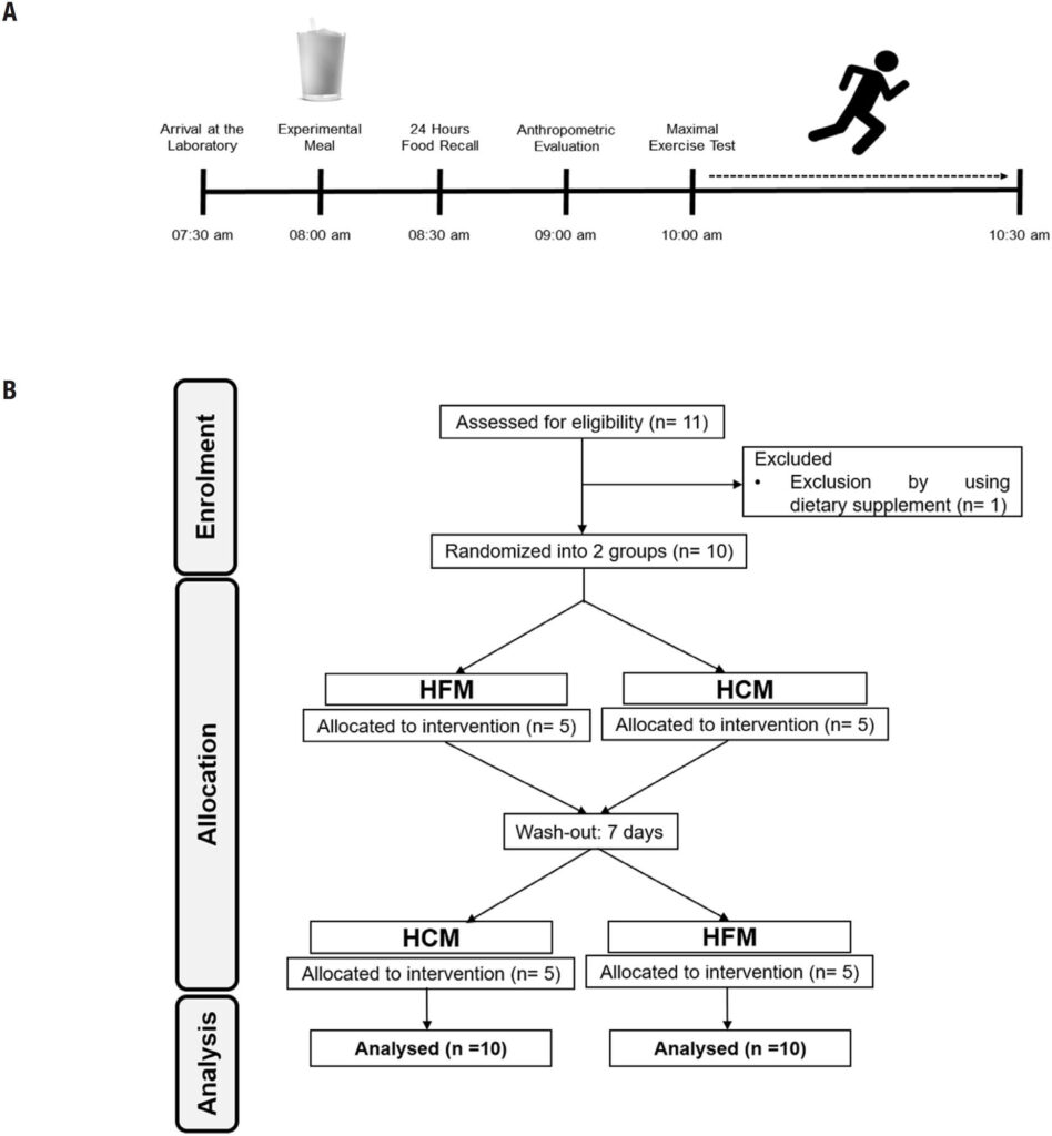 Ten untrained male subjects underwent two days of the protocol. Randomly, they received a high carbohydrate meal or a high-fat meal, receiving the other one in the next protocol. On both days, they performed an incremental treadmill test, with heart rate and maximal oxygen consumption to estimate the oxidation of substrates.