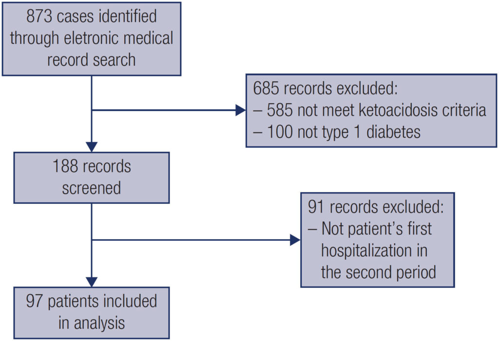 To evaluate the precipitating factors of diabetic ketoacidosis (DKA) in patients with type 1 diabetes hospitalized through the emergency department of a tertiary hospital.