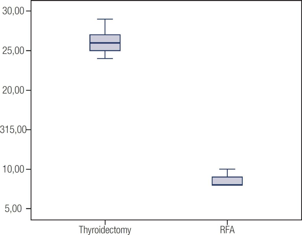 Five cases of RF Ablation were compared with five cases of thyroidectomies conducted in the same period. Similar complication rates were observed in both groups. Shorter operating time and hospital stay were observed for the RF group. In the evaluation of the total cost between procedures, radioblation represented 76% of the cost of partial thyroidectomy.