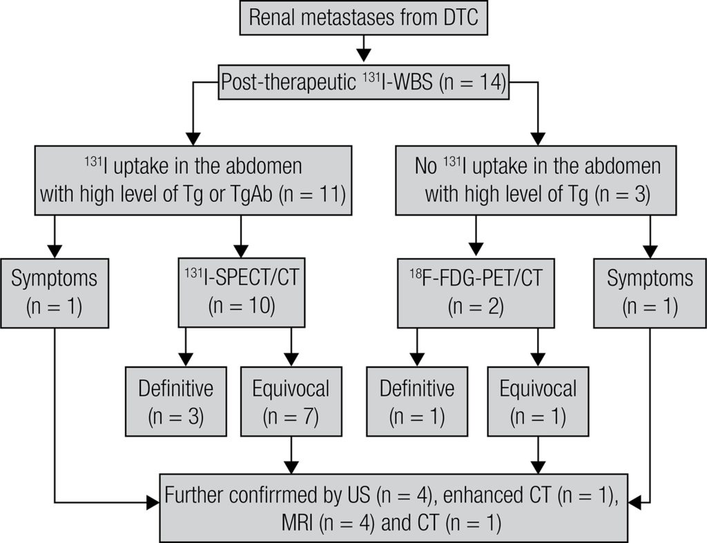 : 131I-SPECT/CT, combined with another imaging modality after 131I-WBS, can contribute to the early detection of renal metastases of DTC. 131I therapy is a feasible and effective treatment for most DTC renal metastases with avidity for 131I. Arq Bras Endocrinol Metab. 2014;58(3):260-9