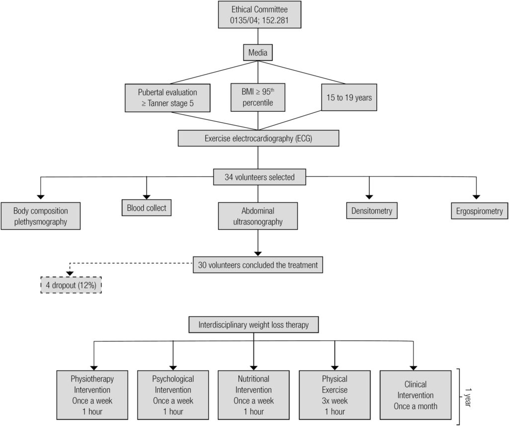 Thirty four post-pubescent obese adolescents with primary obesity, a body mass index (BMI) greater than > 95th percentile of the CDC reference growth charts, participated in the present investigation. Measurements of body composition, bone turnover markers, inflammatory biomarkers and visceral and subcutaneous fat were taken. Adolescents were submitted to one year of interdisciplinary treatment (clinical approach, physical exercise, physiotherapy intervention, nutritional and psychological counseling).