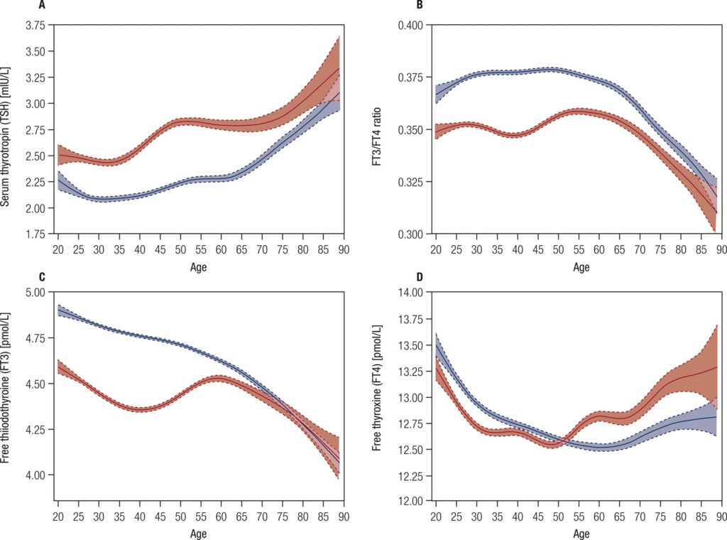 In accord with increasing TSH values during aging, females and older adults have lower FT3 values and lower FT3/FT4 ratios, while the FT4 values remain stable.