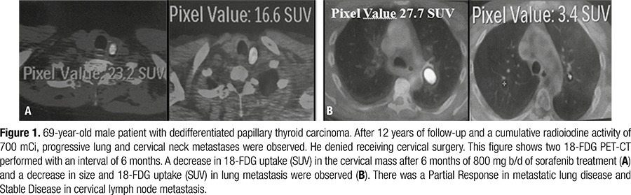 : Eight patients were included (seven papillary, one insular variant). The eight patients meeting study criteria received sorafenib 400 mg orally twice a day until disease progression or unacceptable toxicity developed. One patient showed a partial response with tumor regression of -35%, six months after the beginning of the treatment; five patients exhibited stable disease and two patients had progressive disease and died. Thyroglobulin decreased within 4 weeks in all patients by 50% ± 23%.